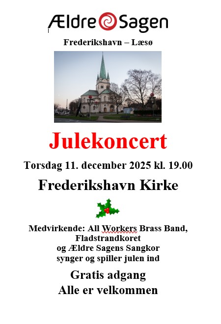Ældre Sagen afholder sin traditionelle, hyggelige julekoncert med deltagelse af Seniorkoret (Ældre Sagens sangkor), Fladstrandkoret og All Workers Brassband. Gratis adgang, alle er velkomne.