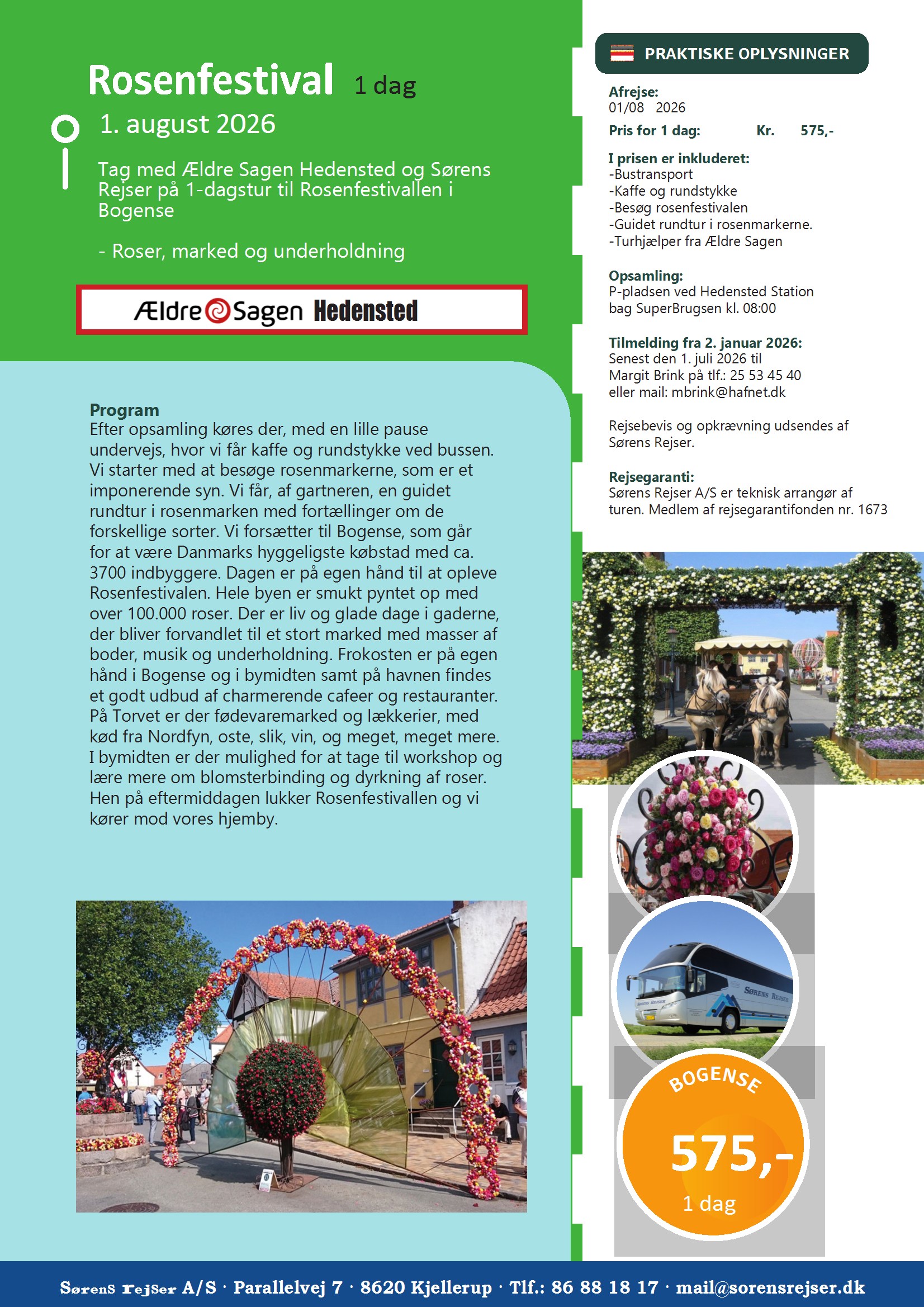 Ældre Sagen i Hedensted arrangerer i samarbejde med Sørens Rejser en 1-dags tur til Rosenfestivallen i Bogense. Tag med og se roser, marked og underholdning