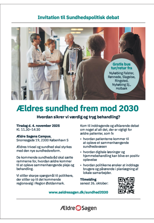 Debatten finder sted i Ældre Sagens Campus i Snorresgade fra kl. 11.30 – 14.30 med opstillede politikere i den nye Region Østdanmark. Og vi skal fylde salen med engagerede ældre, der gerne vil vise deres interesse i debatten.