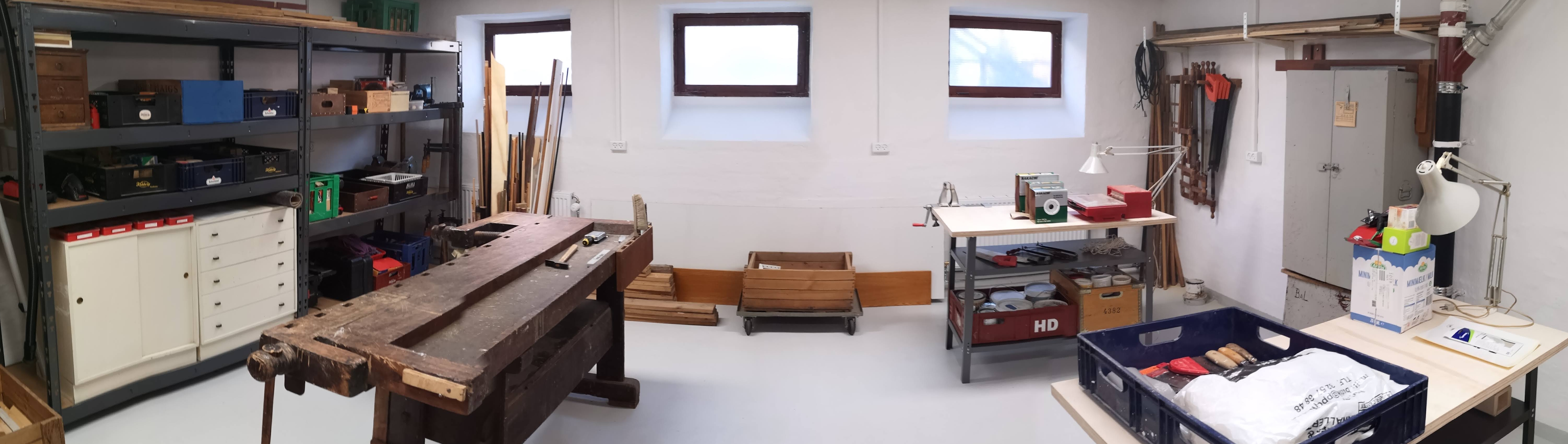 Værkstedet er udstyret med det meste håndværktøj samt et par håndmaskiner til det grove, og vi har en god samling af søm og skruer mv. til rådighed.