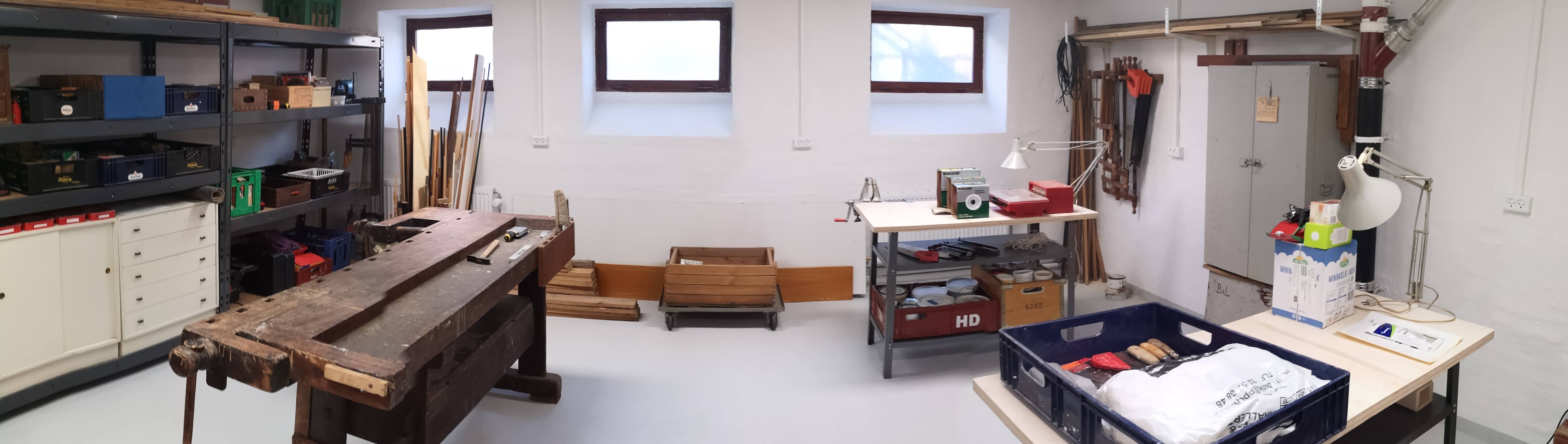 Værkstedet er udstyret med det meste håndværktøj samt et par håndmaskiner til det grove, og vi har en god samling af søm og skruer mv. til rådighed.