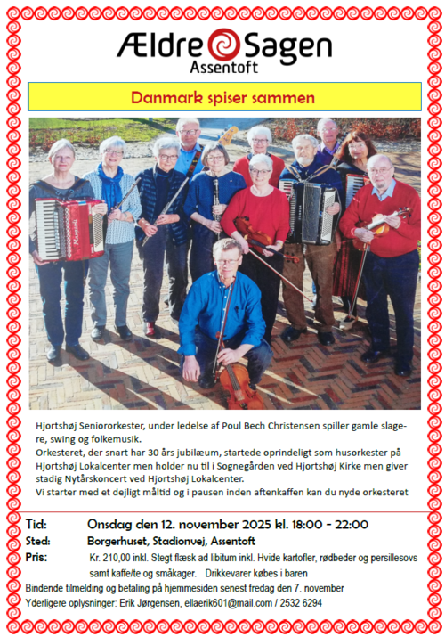 Hjortshøj Seniororkester underholder denne aften, efter at vi har nydt stegt flæsk ad libitum med hvide kartofler, rødbeder og persillesovs. Aftenkaffen får vi efter orkesters underholdning.