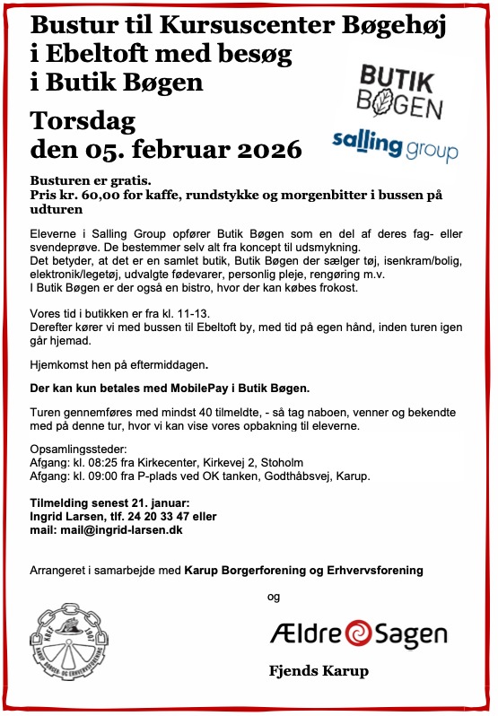 Vi besøger Salling-gruppens kursuscenter, hvor afgangseleverne har opført BUTIK BØGEN. Kaffe med rundstykke i bussen på udturen. Det er et stort udvalg vare. Kun MobilePay i Butik Bøgen. Der kan købes frokost i den tilhørende Bistro. Efterfølgende lidt tid på egen hånd i Ebeltoft.
