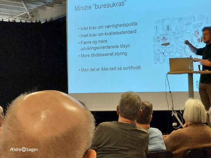 Traditionen tro blev den indledt med indlæg fra Favrskov Kommune. I år var det sekretariatschef for Social og Sundhed, John Rene Keller Lauritzen og områdeleder i Hjemmeplejen Mette Fogh Petersen, der kom og fortalte om implementeringen af den nye ældrelov. Favrskov har været tidligt ude, så tankerne om at arbejde i faste teams er allerede ført ud i livet, så helhedspleje er det nye, hvor plejevisiterede nu er inddelt til at få pleje hjemme, opdelt i 8 ”pakker”. Velfærdsteknologi blev også nævnt, og der blev opfordret til, at man besøgte Hjælpemiddelservice, Kildebakken 6, 8370 Hadsten, for at se de mange muligheder, der findes. Det blev også nævnt, at lovgivningsmæssigt er en robotstøvsuger nu ikke er noget, som Kommunen kan stille til rådighed, bortset fra til en afprøvning i hjemmet.