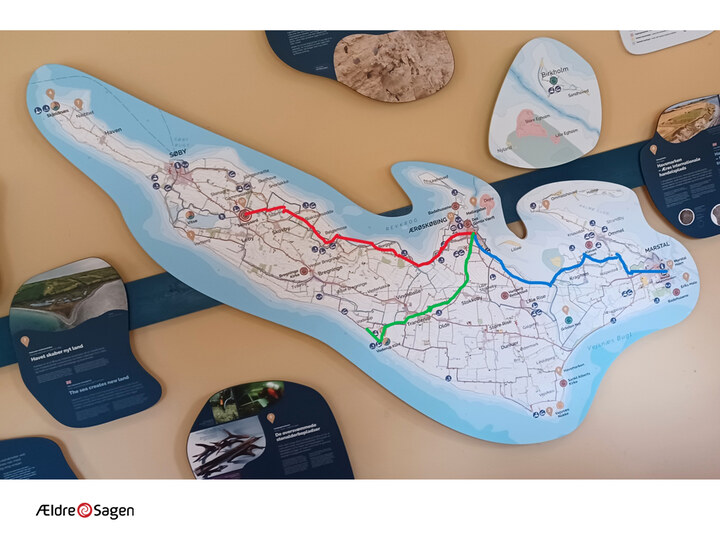 (På Ærø kortet er turene markeret med blå rute til Marstal, rød rute til Søbygaard, grøn rute til Voderup klint).