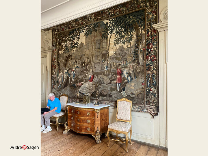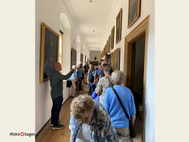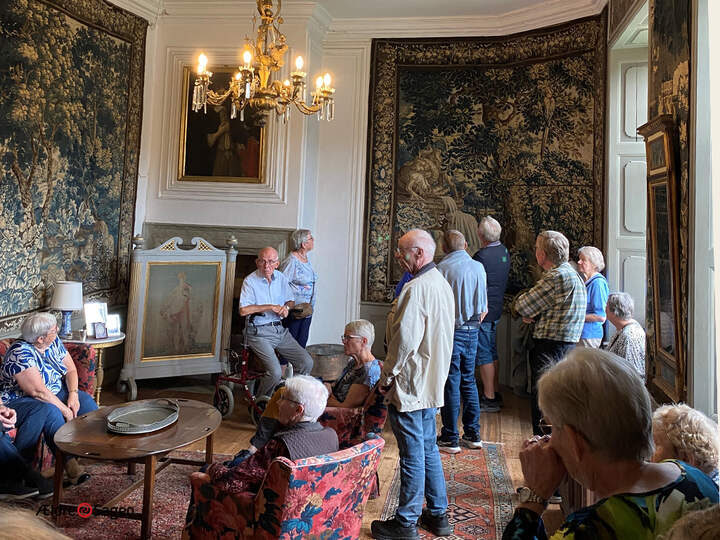 Her blev vi taget med på en spændende rundvisning, hvor vores dygtige og engagerede guide virkelig formåede at levendegøre både slægtens historie og de mange smukke portrætter, gobeliner, tapeter og møbler, som vi fik lov at opleve.