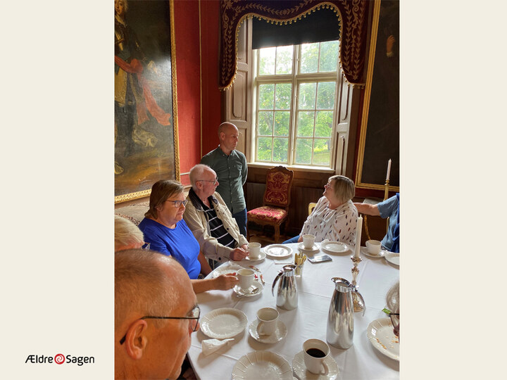 Efter rundvisningen satte vi os til rette i den imponerende riddersal og nød en kop kaffe sammen. Det blev en hyggelig og stemningsfuld afslutning på en dag fuld af oplevelser, som vi alle nød i hinandens selskab.