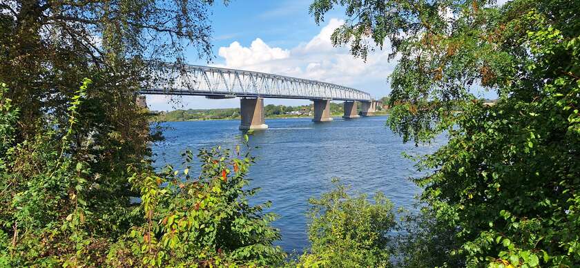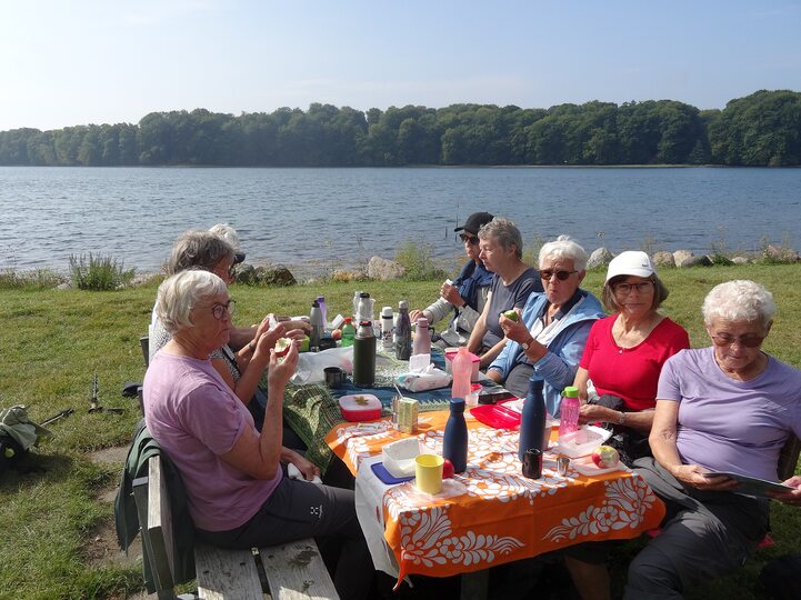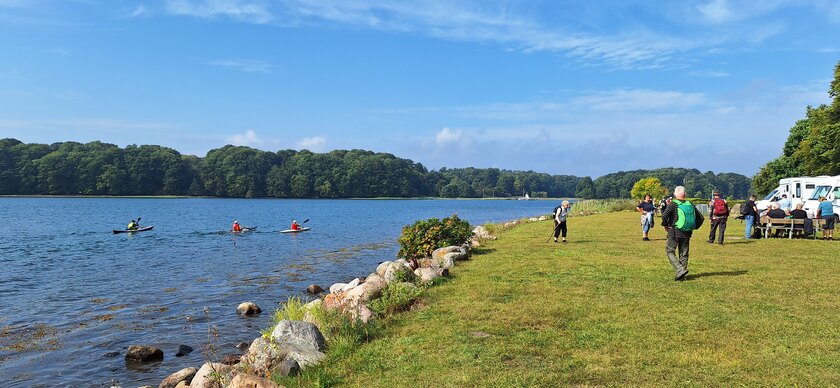 Vores tur fortsatte gennem skov, gennem slotsparken og over den nænsomt indhegnede dyrehave med store flokke af dådyr. Dagens frokost (medbragte, selvsmurte madpakker og en dertil hørende bjesk) blev indtaget i dejligt solskin på Fænø Odde Rasteplads ved borde/bænke og med en pragtfuld udsigt over det smalle vand til Fænø og til de forbipasserende kajakroere. Efter frokosten fulgte vi Hindsgavlstien frem til byen og Clay-museet, og langs vandet gennem Kongebroskoven til den gamle Lillebæltsbro.