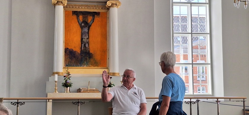 Vi gjorde ophold med historie ved Landsoldaten og Prinsens Port, inden turen afsluttedes i Garnisonskirken, også kaldet Sct. Michaelis Kirke. Her fortalte Sammy om kirken, som blev restaureret i 2018 (350-års jubilæum). Oprindeligt blev kirken kaldt Den tyske Kirke, da garnisonen overvejende var tysk. I dag er der stadig en garnisonspræst ansat ved kirken. I kirken sang vi Kongernes Konge, hærens sang, som bl. a. bruges, når udstationerede dræbte soldaters kiste under musik bæres ud af flyet.