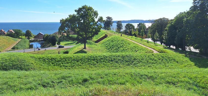 Sammy tog os med gennem enkelte af byens gader med små korte historier frem til Kongens Bastion, hvor vi fik voldenes historie og byens betydning i forskellige krige. Fredericia blev grundlagt som fæstning, og til denne hørte en gruppe soldater. En egentlig garnison fik byen i 1679 og har siden bestået af mange forskellige afdelinger med infanteri, kavaleri og artilleri. Garnisonen har sammen med fæstningsværkerne præget Fredericias bybillede og historie og har udgjort en væsentlig del af byens identitet. Udfaldet fra Fredericia den 6. juli 1849 bliver hvert år markeret. Vores vandring fortsatte over Dronningens Bastion, Prinsen Bastion med fortælleophold (og der var meget at fortælle) frem til Det Hvide Vandtårn, bag hvilket vi spiste vores madpakke. Her sang vi ”to hvide liljer” af Sigfred Pedersen. Hvide liljer er ofte forbundet med begravelse og symboler som fred og ro.