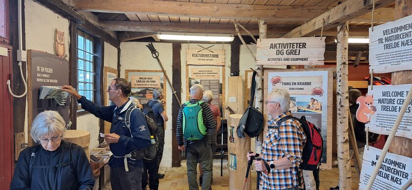 Alle biler med 39 deltagere var som aftalt fremme ved P-pladsen ved Trelde Næs Naturcenter kl. 10. Vi startede med selvguided orienterende besøg på Naturcentret.
