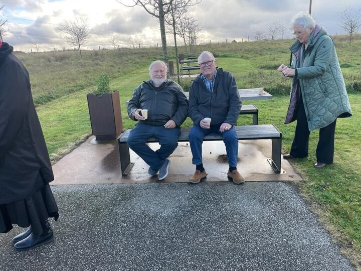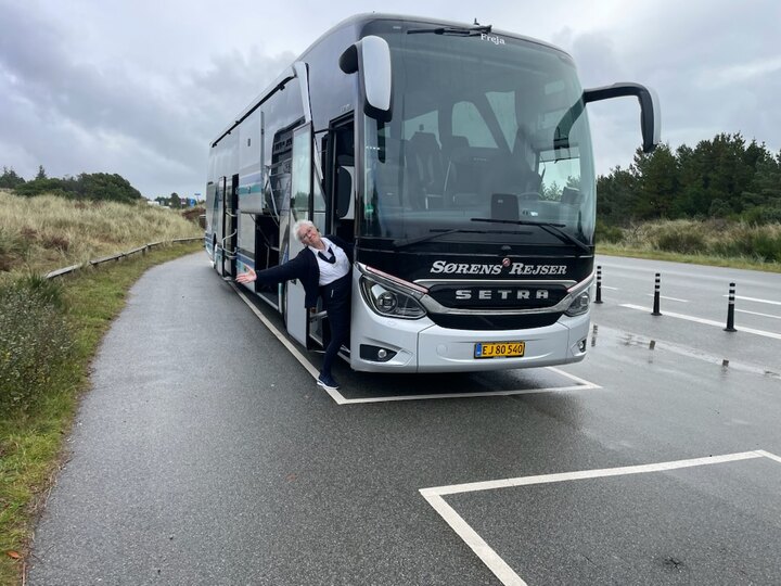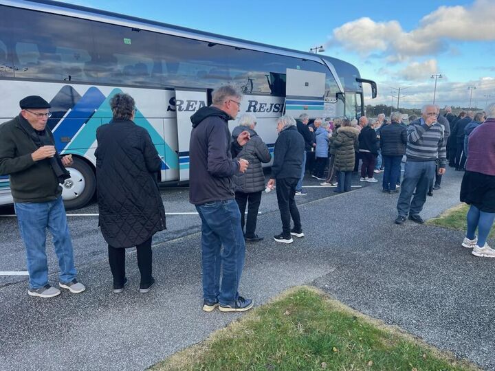 På grund af vejret indtager vi kaffe og rundstykker i bussen. Bussen er hel ny og det er Catrins bus, som hun er vældig stolt af. Bussen er meget avanceret med pantautomat under bagtrappen. Vi får også en ”lille skarp” til kaffen som hende, som var årsag til den lille forsinkelse, gav. Det gav en vældig god snak i bussen. Ind imellem småregn kom der også sol, så det var en pæn køretur til Tirpitz, hvor vi landede til kl. 10.