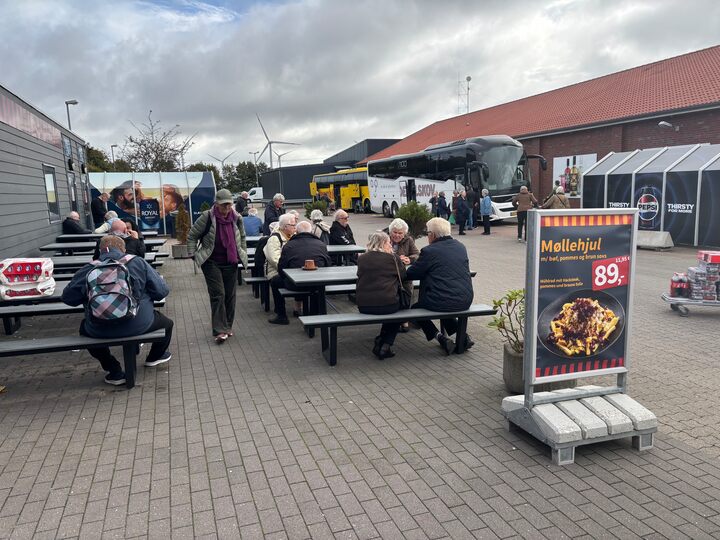 Vi startede næste dag med morgenmad inden turen gik til Fleggaard i Süder Lügum. Her var åbningstiden kl. 11.00, men vi ankom 15 min før så der var lige tid til en lille morgenbitter sponseret af Ældre Sagen inden indkøbene blev foretaget.