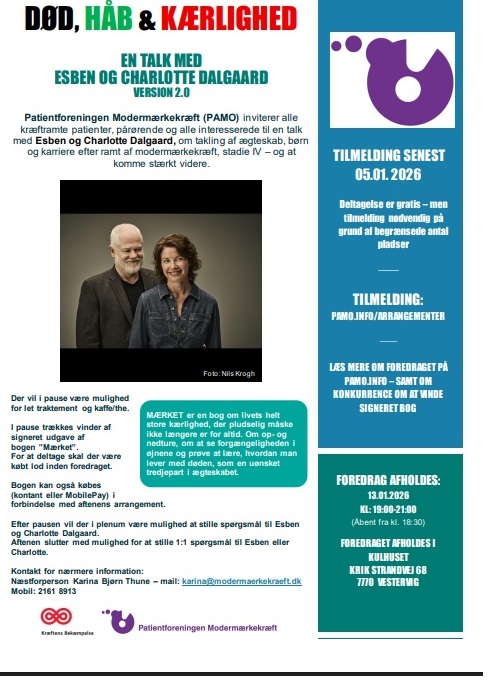 Patientforeningen Modermærkekræft (PAMO) inviterer alle kræftramte patienter, pårørende og alle interesserede til en talk med Esben og Charlotte Dalgaard, om tackling af ægteskab, børn og karriere efter ramt af modermærkekræft, stadie IV – og at komme stærkt videre.