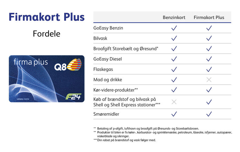 Du kan vælge mellem Q8 Benzinkort og Q8 Firmakort Plus - nedenfor kan du se forskellene mellem de 2 kort. Bestil det kort der passer dit behov bedst, men du kan også bestille begge kort og få alle fordelene.