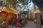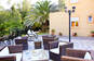Stor terrasse med borde og stole udenfor receptionen, hvor du kan nyde din morgenmad. Bar som serverer varme og kolde drikkevarer samt enkle retter.